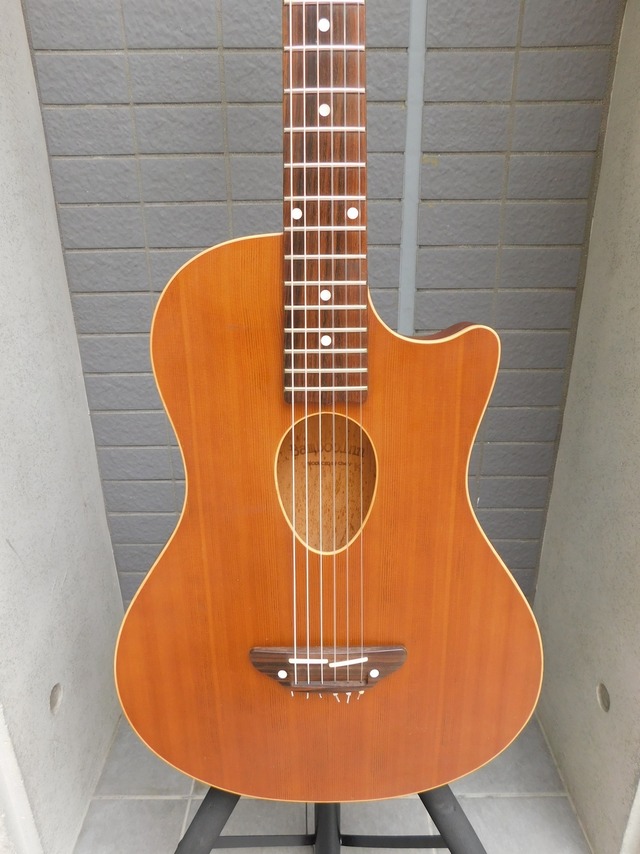 くり抜かれたマホガニー単板をバックに、シダー単板をトップ材に使用。ボディに巻かれたバインディングはなんと竹製。