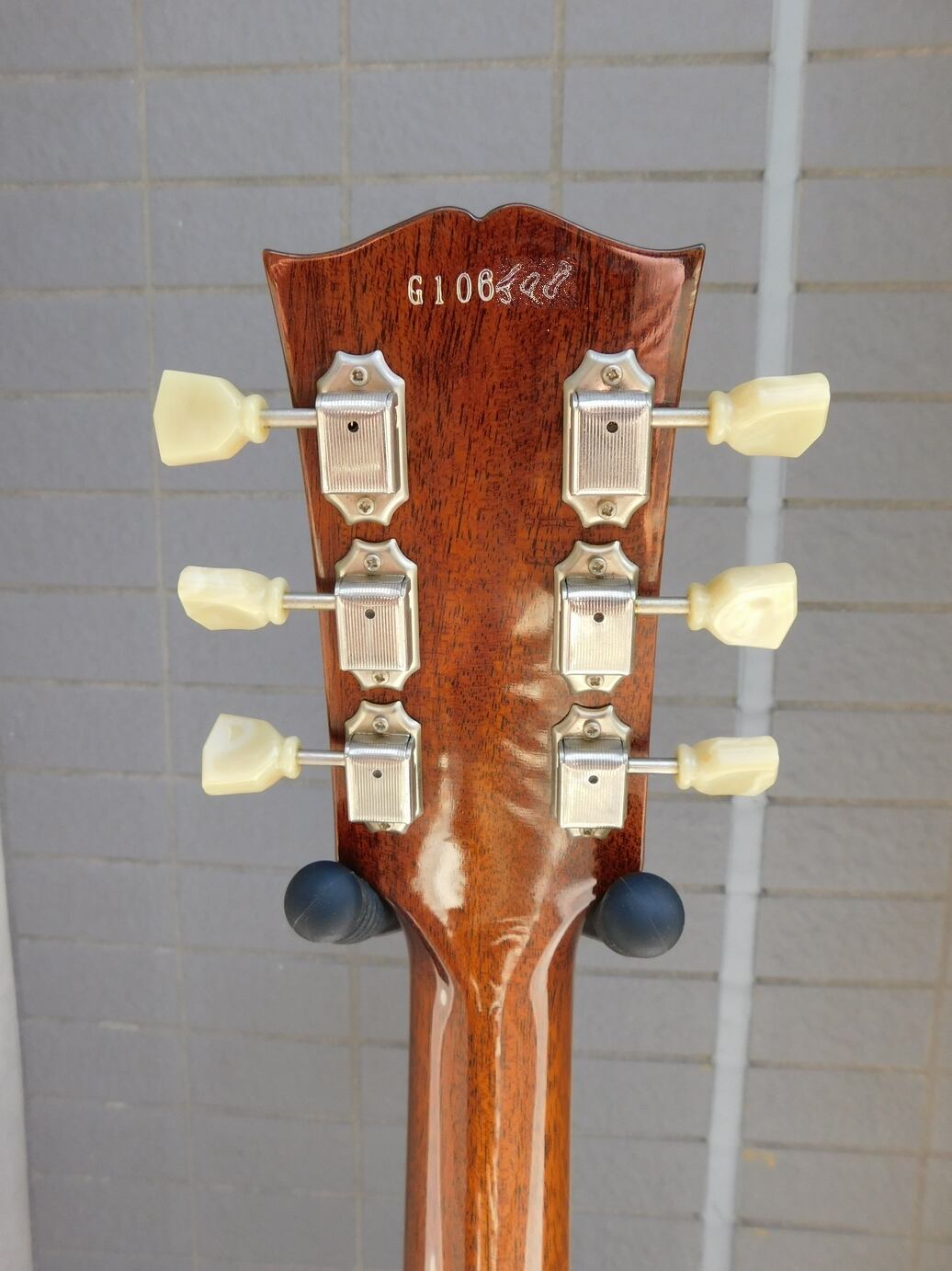 ゴールドトップカラー、ラップアラウンドタイプのブリッジ、クルーソンタイプのペグなど1954年頃の特徴的な仕様