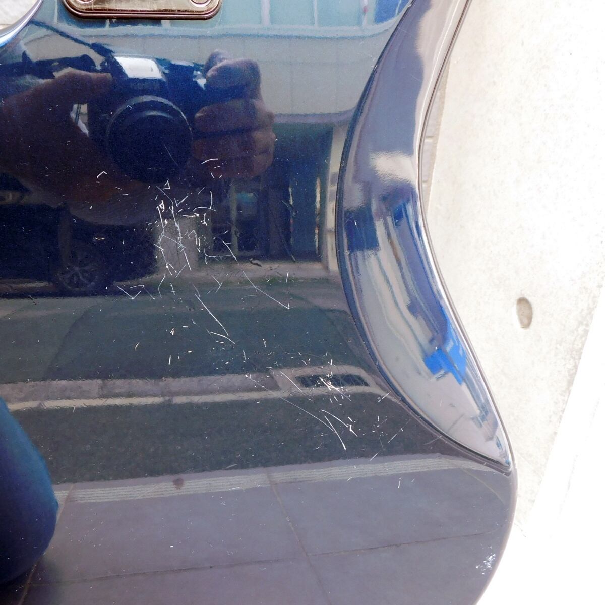 深みのあるダークブルーのメタリックカラーとマッチングヘッド、さらに光沢のあるパール柄ピックガードの組み合わせは、モダンかつ高級感のある佇まいに仕上がっています。
