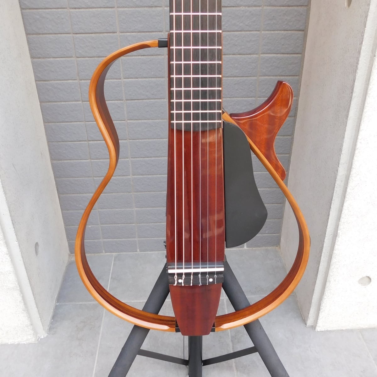 共鳴胴がないため生音は非常に静か。夜間の自宅練習でも周囲を気にせず演奏に没頭できます。また、左フレームを取り外すことでコンパクトに収納でき、持ち運びにも適しています。